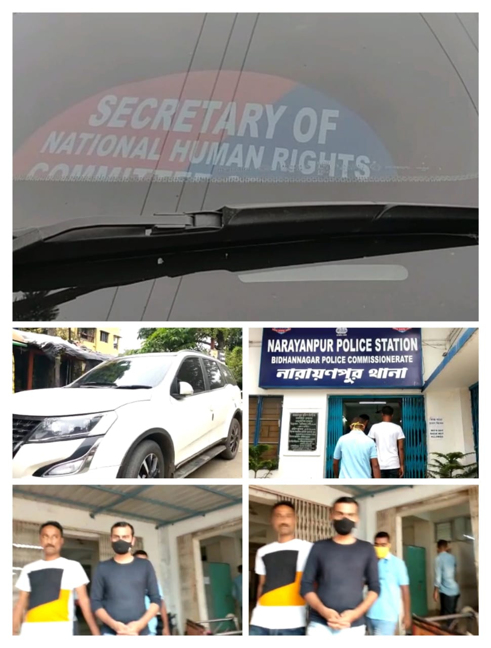 রাজারহাট জগাড়ডাঙ্গা এলাকার ডিরোজিও কলেজের সামনে নাকা তল্লাশি চালাচ্ছিল নারায়নপুর থানার পুলিশ। সেই সময় একটি সাদা এক্সএইউভি গাড়িতে ন্যাশনাল হিউম্যান রাইটস কমিশনের সেক্রেটারি লেখা দেখলে সন্দেহ হয় পুলিশের। সেই সময় গাড়ির চালক আকাশ ভান্ডাওয়াতকে জিজ্ঞাসাবাদ করে পুলিশ, সঠিক কোনও পরিচয় পত্র দেখাতে পারেনি বলে পুলিশ সূত্রে খবর। এরপর তাকে আটক করে নারায়নপুর থানায় নিয়ে যায় পুলিশ। এবং দিল্লির ন্যাশনাল হিউম্যান রাইটস কমিশনেও খোঁজ নিয়ে পুলিশ জানতে পারে এই পরিচয়ের কোনও ব্যক্তি তাদের ওখানে কর্মরত নয়। পুলিশ সূত্রে খবর পুলিশের জেরায় স্বীকার করে তিনি ভুয়ো হিউম্যান রাইটস কমিশনের সেক্রেটারি পরিচয় দিত বিভিন্ন জায়গায়। পরবর্তীতে অভিযুক্তকে ব্যারাকপুর আদালতে তোলে এবং পুলিশ তাকে নিজেদের হেফাজতে নেওয়ার আবেদন জানায়। ওই ব্যক্তি ভুয়ো পরিচয় ব্যবহার করে কোনও রকম অসামাজিক কাজ করেছে কিনা সেই বিষয়ে তদন্ত শুরু করেছে নারায়নপুর থানার পুলিশ।